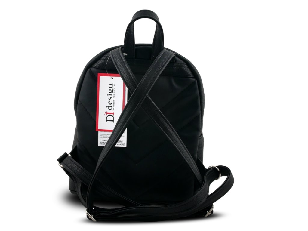 Batoh značky Dí Design od české návrhářky Jany Dapecí. Batoh má dvě hlavní části, větší a menší hlavní kapsu (ta se rozepíná pomocí zipu, na kterém je připevněný řetízek). Uvnitř velké kapsy se dále nachází jedna malá kapsa na zip a jedna bez zipu například na mobilní telefon. Délka popruhů je až 120cm. Materiál syntetický. Rozměr 26x33x12cm.