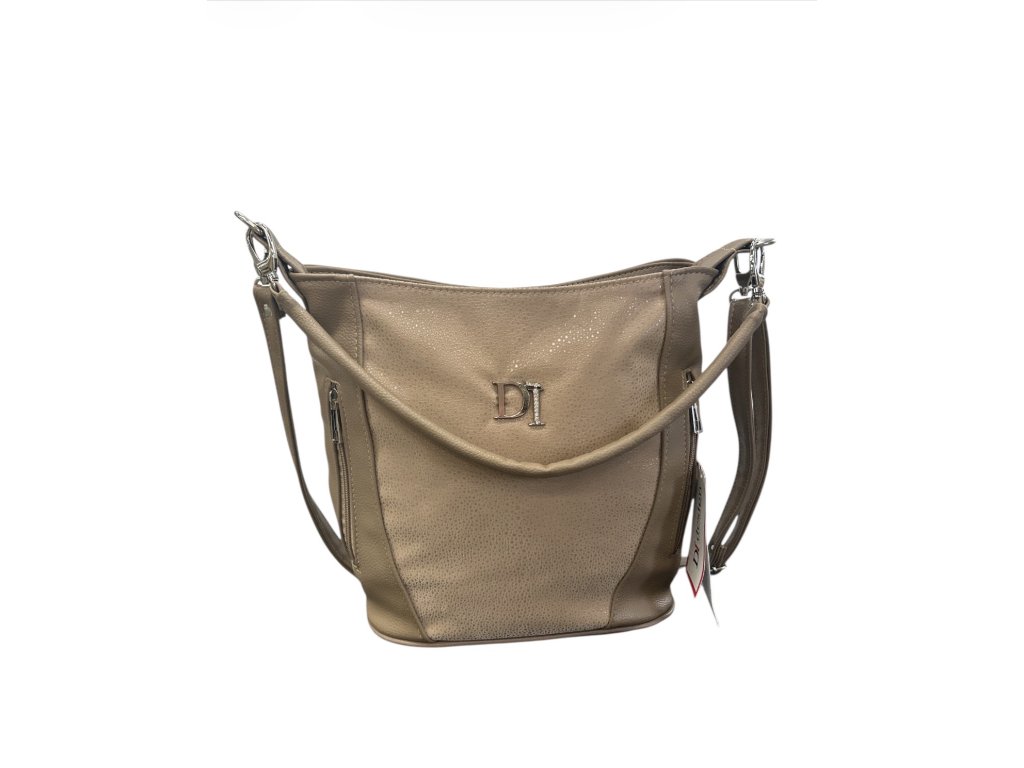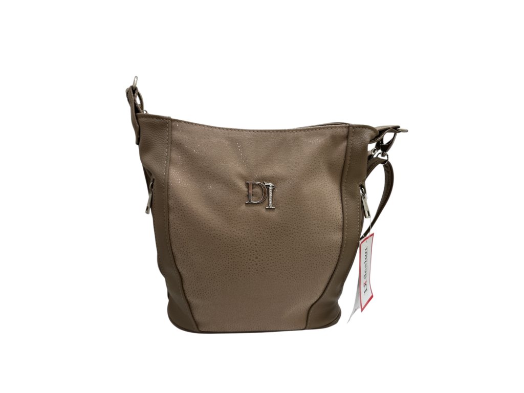Na přední straně najdete výrazné logo DI, které dodává kabelce módní šmrnc. Model nabízí prostorný hlavní prostor se zipem, vnitřní kapsy pro lepší přehled a zadní zipovou kapsu pro rychlý přístup k drobnostem. Součástí je dlouhý nastavitelný popruh i krátké držadlo, takže ji můžete nosit jak na rameni, tak crossbody.