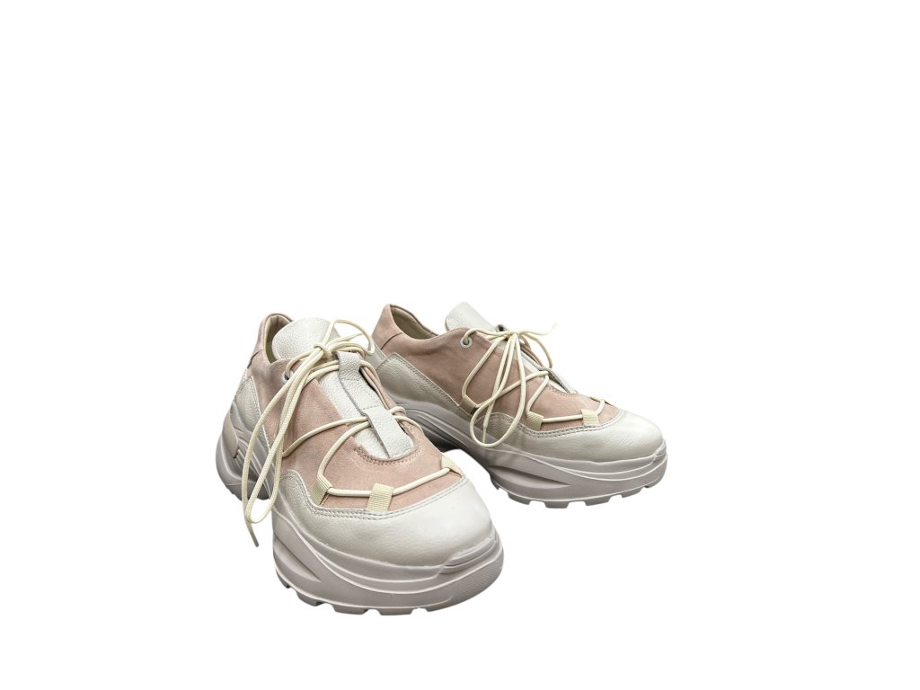 Moderní béžovo-růžové tenisky z kombinace kůže a semiše s originálním vázáním. Stylový vzhled, komfort a lehkost pro každý den.
