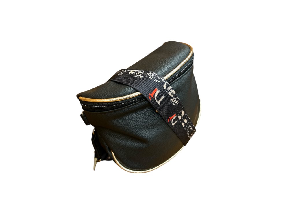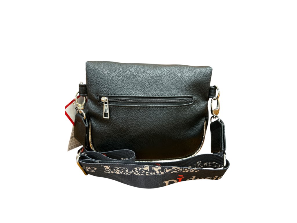 Elegantní černá dámská crossbody kabelka Di Design s výraznou strukturou materiálu, zdobenou zlatým lemováním a širokým designovým popruhem. Praktická, lehká a ideální pro každodenní nošení.