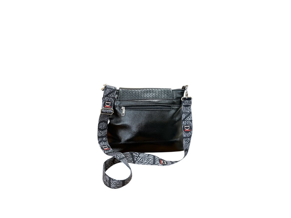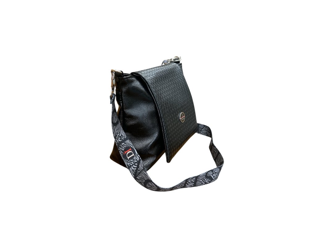 Stylová dámská kabelka v černé barvě s elegantní klopou a výrazným popruhem je ideální volbou pro každodenní nošení i volný čas.