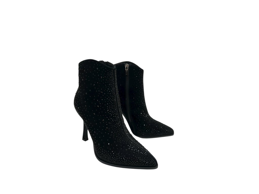 Luxusní černé kotníkové boty Di Design z pravé broušené kůže zdobené třpytivými kamínky. Elegantní model na jehlovém podpatku, který dodá každému outfitu výjimečný styl a šmrnc.