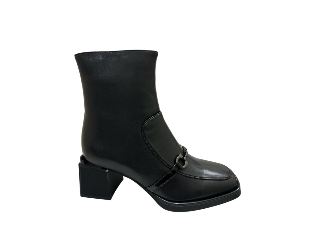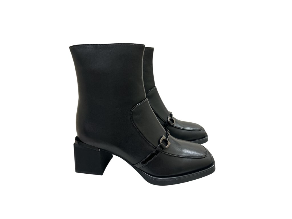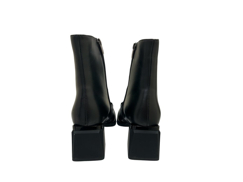 Stylové černé kožené kotníkové boty s elegantní kovovou ozdobou a moderním hranatým podpatkem. Nadčasový design, který kombinuje komfort, kvalitu a šmrnc.
