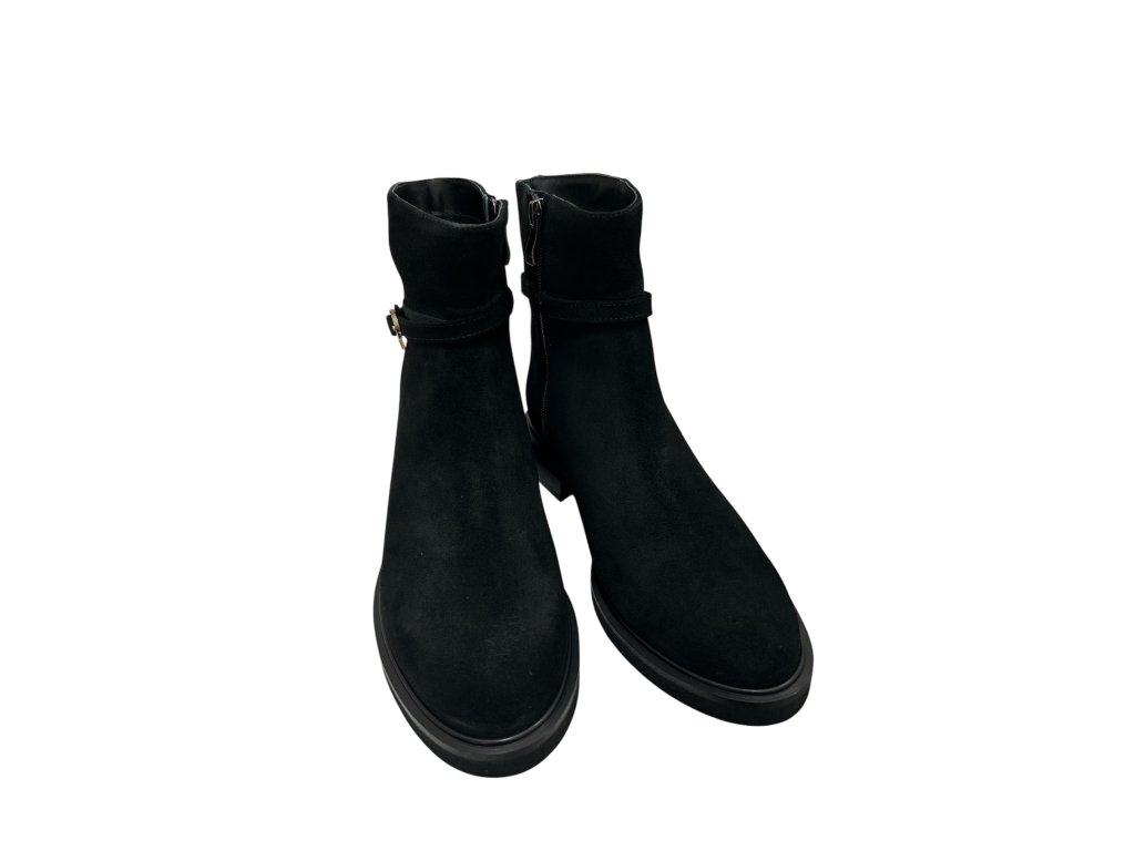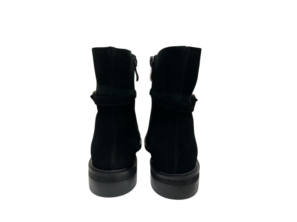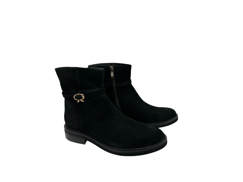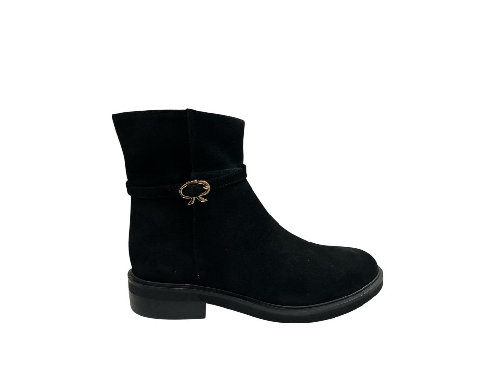 Elegantní černé kotníkové boty s decentní zlatou ozdobou dodají vašemu outfitu sofistikovaný nádech. Vyrobené z kvalitní broušené kůže, ideální pro ženy, které milují styl i pohodlí.