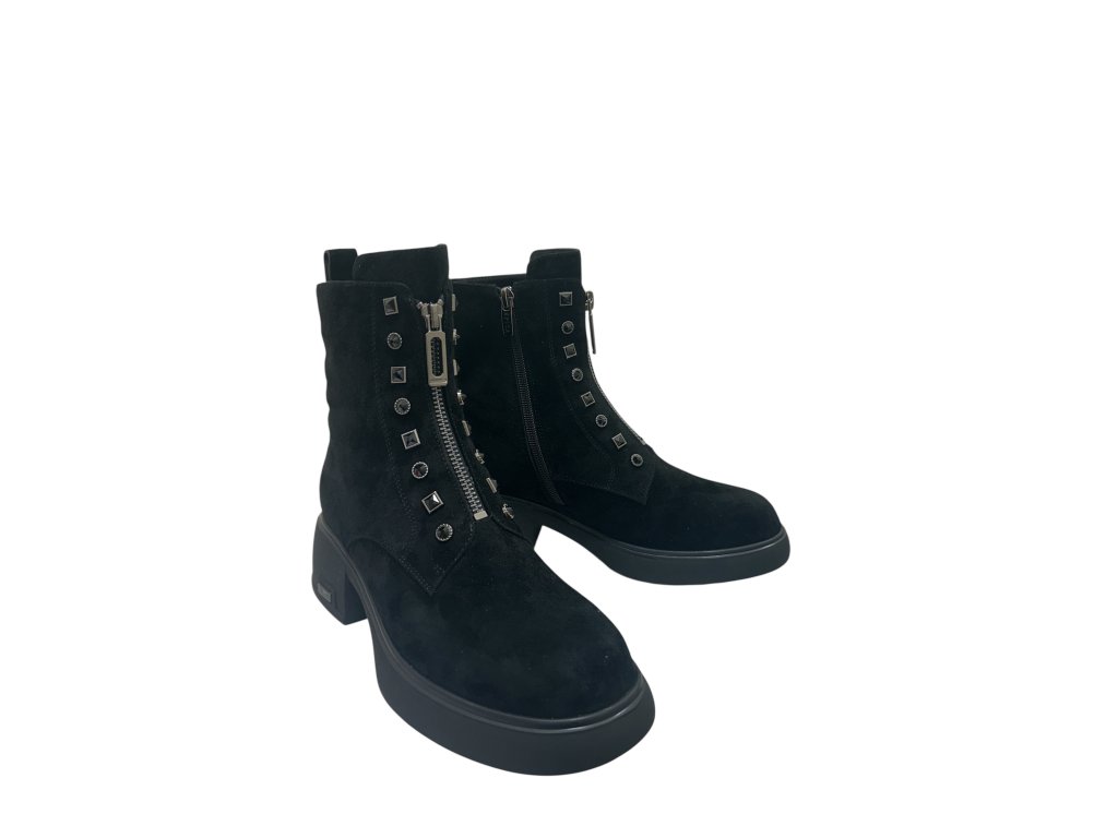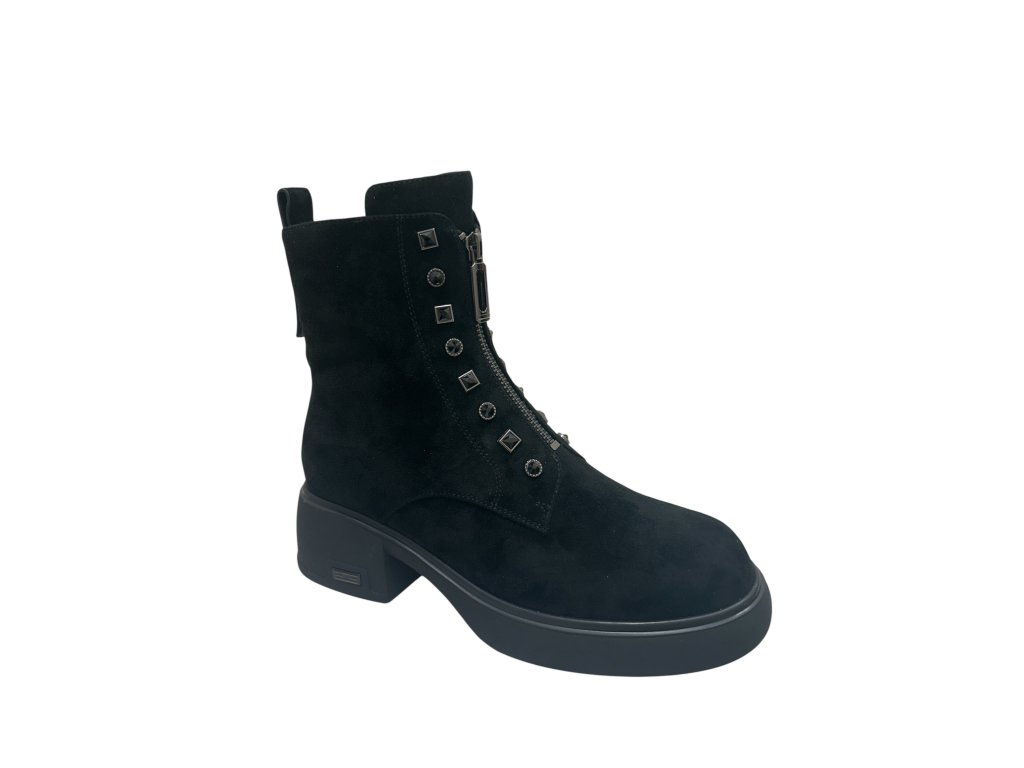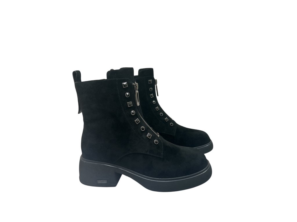 Stylové černé kotníkové boty Di Design z broušené kůže s dekorativními kovovými cvočky a praktickým zipem vpředu. Moderní vzhled, pohodlí a sebevědomí v jednom kroku.