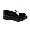Lesklé černé mokasíny jsou univerzální obuv, která dokonale kombinuje styl a pohodlí. Jejich minimalistický design v klasickém černém odstínu s lesklým provedením dodává botám elegantní a luxusní vzhled, který se hodí k jakémukoliv outfitu – od ležérních džínů po formální kalhotové kostýmy. Zlaté zdobení na nártu přidává sofistikovaný a moderní nádech. Jsou ideální volbou pro každodenní nošení i pracovní příležitosti.