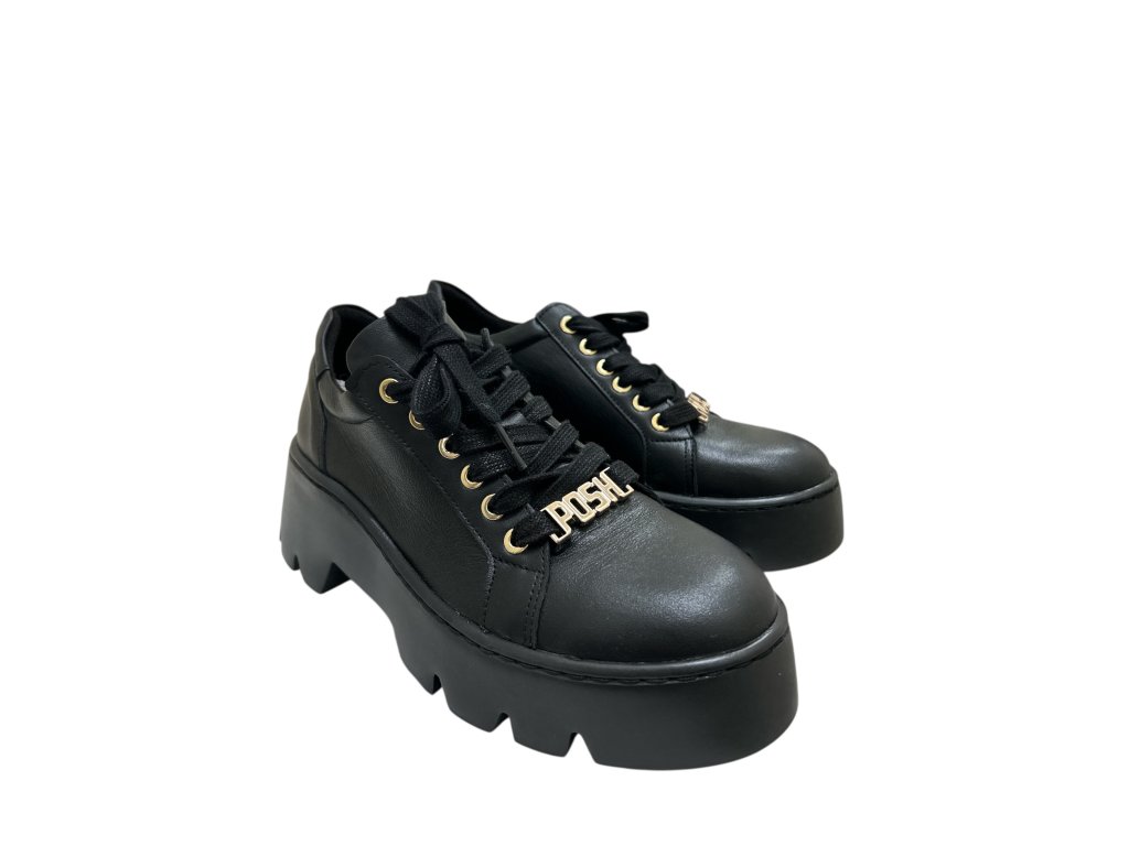 Stylová černá módní polobotka představuje ideální spojení elegance a pohodlí. Vyrobena z kvalitního hladkého materiálu s koženým vzhledem, zaujme svým čistým designem doplněným o zlaté detaily a kovový nápis POSH na tkaničkách, který dodává celému modelu luxusní nádech.