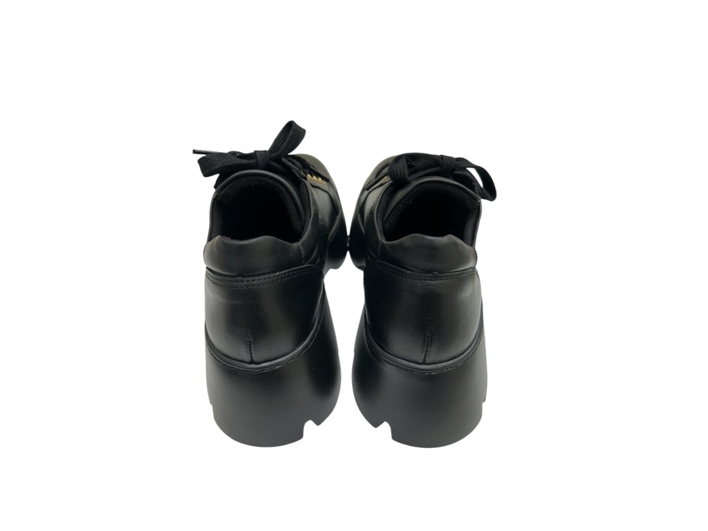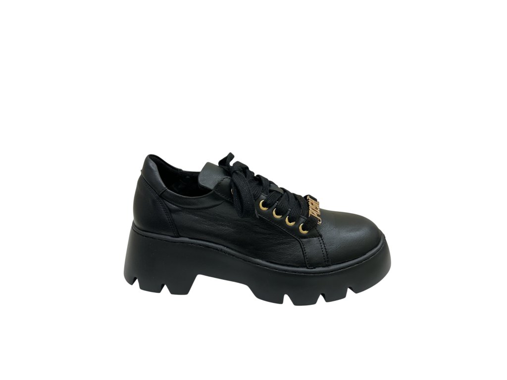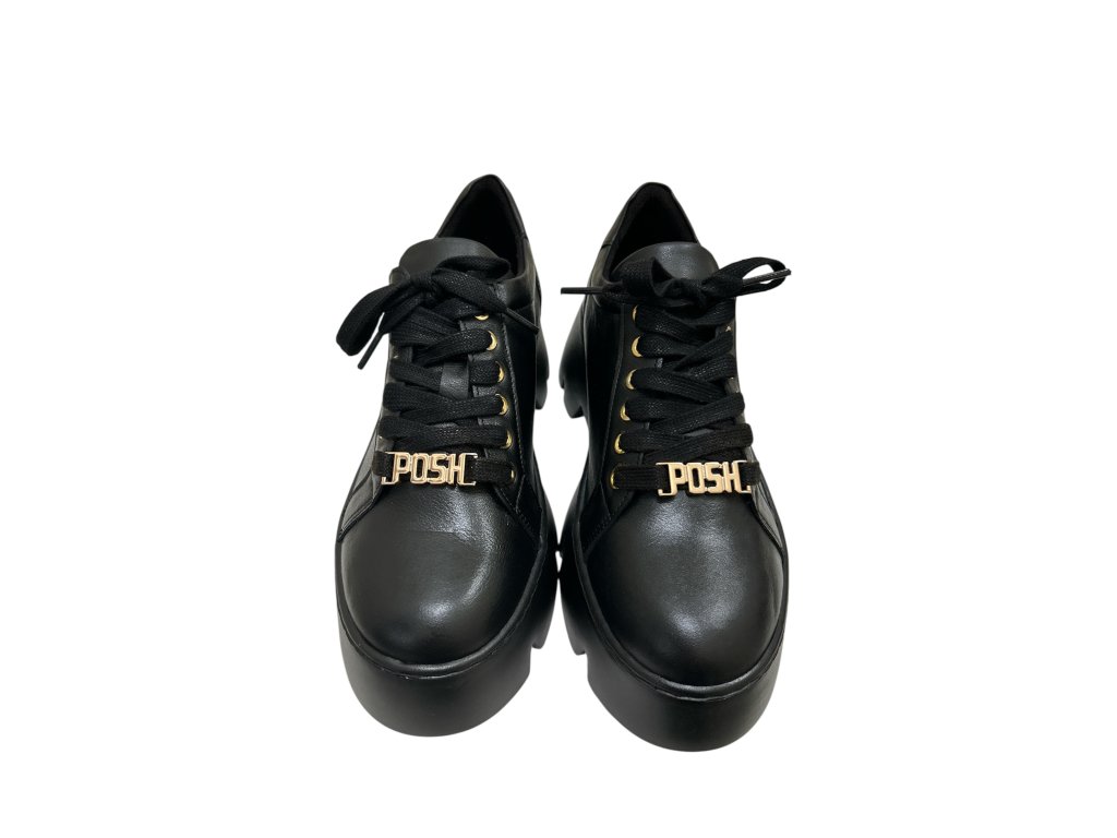 Stylová černá módní polobotka představuje ideální spojení elegance a pohodlí. Vyrobena z kvalitního hladkého materiálu s koženým vzhledem, zaujme svým čistým designem doplněným o zlaté detaily a kovový nápis POSH na tkaničkách, který dodává celému modelu luxusní nádech.