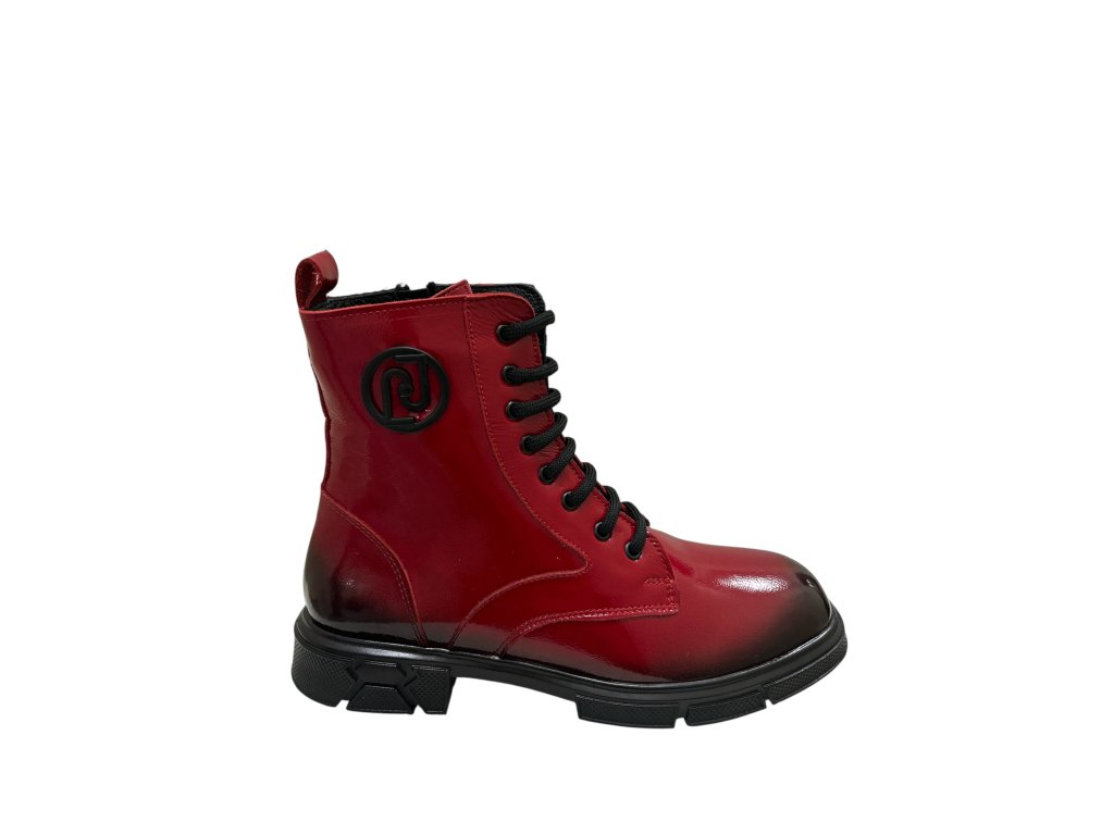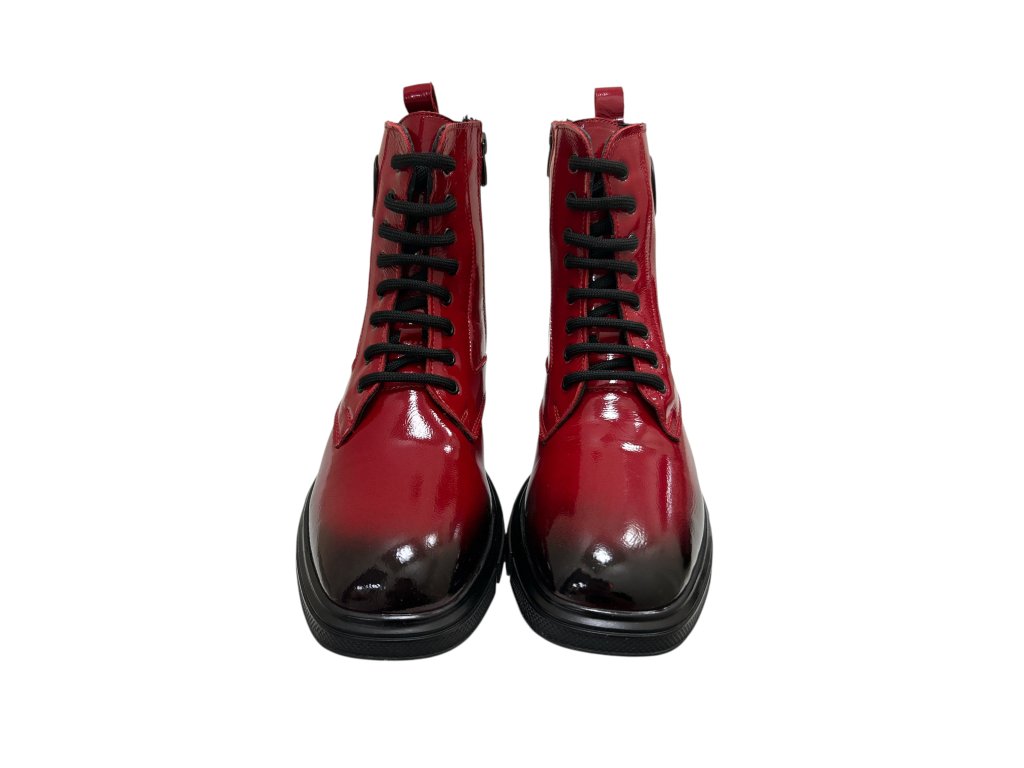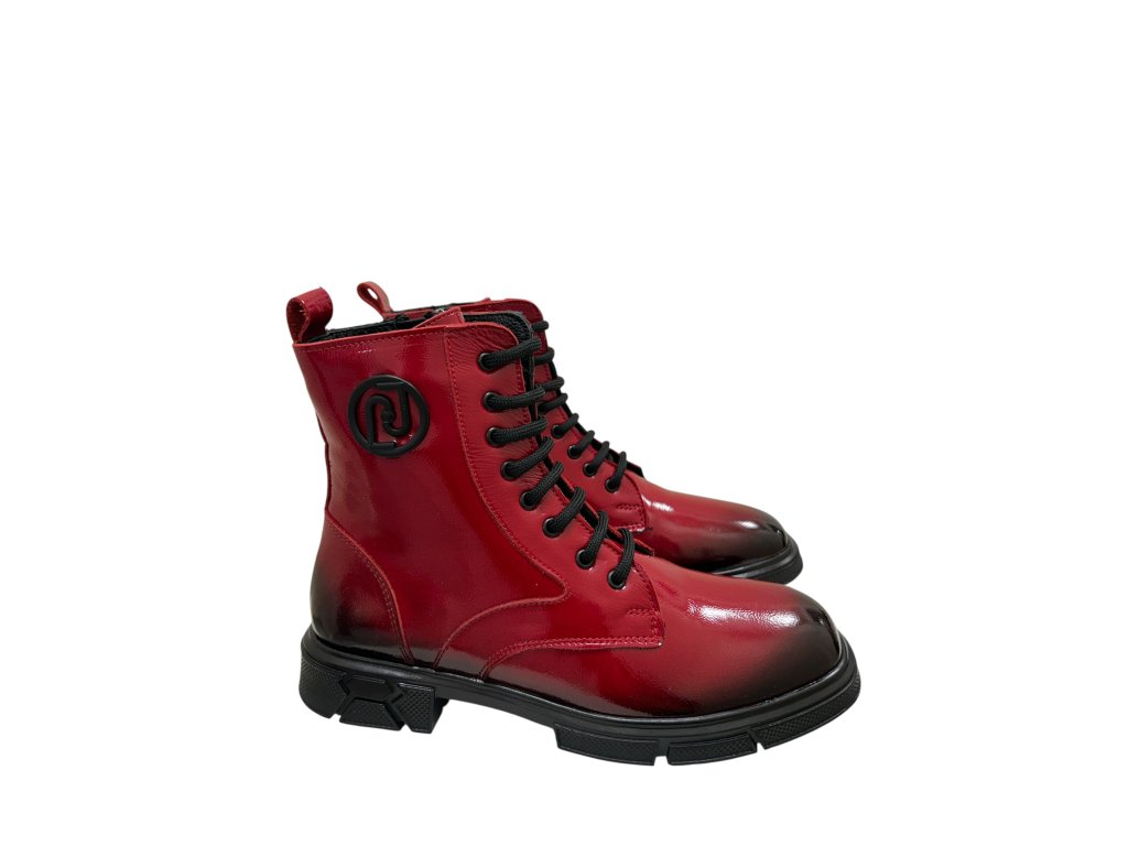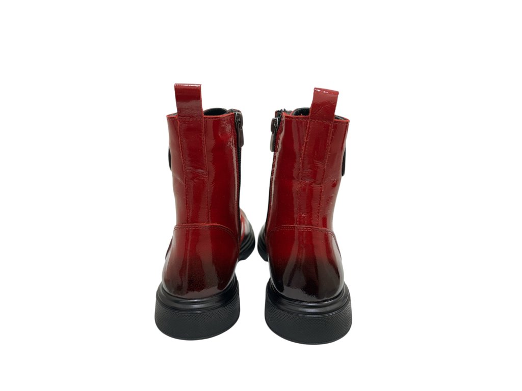 Stylové červené kotníkové boty GUERO v lakovaném provedení s černými detaily a praktickým bočním zipem. Trendy design pro ženy, které se nebojí vyniknout.