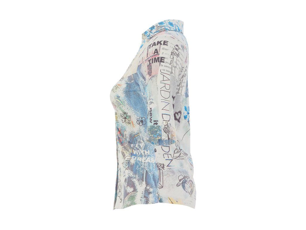 Na první pohled zaujme její originální kolážový potisk, ve kterém se prolínají kresby, nápisy a jemné ilustrace v odstínech světle modré, krémové, šedé, béžové a pudrově růžové. Celek působí velmi lehce, kreativně a žensk y, ale stále elegantně a dobře nositelně i na běžný den.