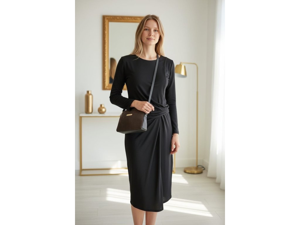 Elegantní černé dámské šaty s dlouhým rukávem, které díky splývavému efektu a jemnému řasení krásně zvýrazní ženskou siluetu. Nadčasový střih vhodný jak na běžné nošení, tak do práce i na společenské události.