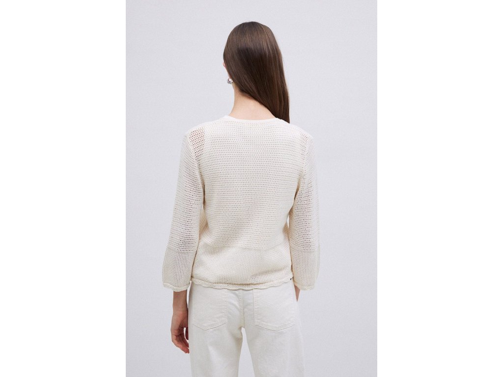Lehký krémový pletený kardigan Yerse s jemně strukturovaným vzorem a zavazováním vpředu působí vzdušně, žensky a velmi elegantně. Ideální volba pro jarní a letní vrstvení.