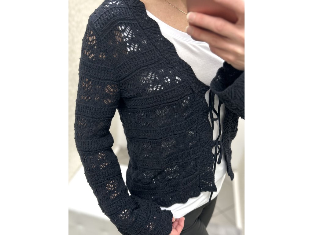 Tento lehce průhledný kardigan v tmavě modré barvě zaujme svým jemným krajkovým vzorem, který dodává outfitu elegantní a nadčasový vzhled. Díky rovnému, lehce kratšímu střihu se skvěle kombinuje se šaty, sukněmi i kalhotami s vyšším pasem.