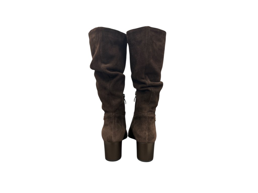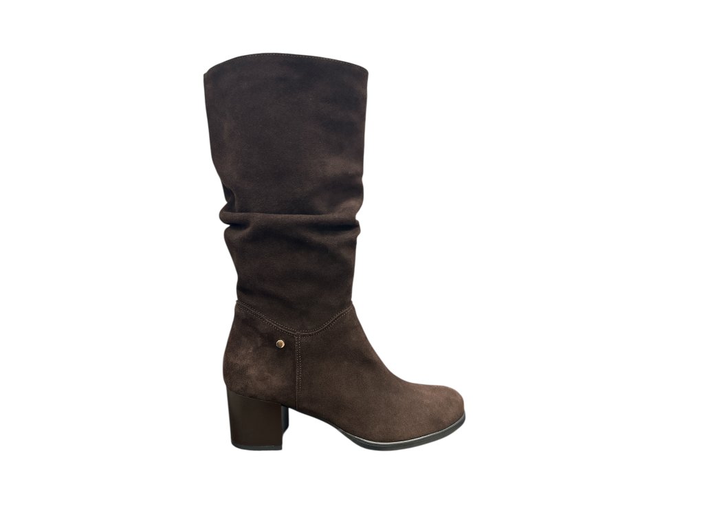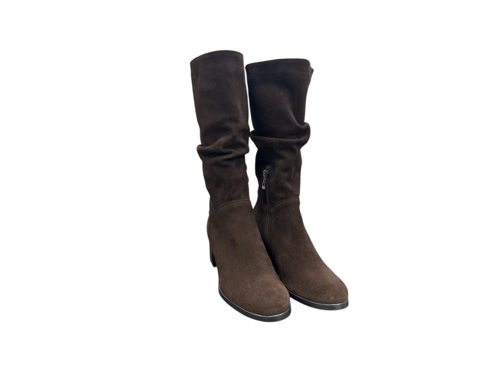 Elegantní kožené kozačky v módní tmavě hnědé barvě se středně vysokým podpatkem a jemně řaseným efektem v horní části. Stylový kousek, který krásně prodlouží nohu a bude se hodit ke kalhotám i šatům.
