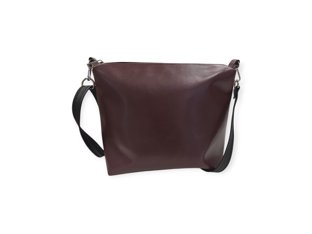 Hlavní kabelka má pevná ramínka ve vínovém tónu, ladící s ozdobným detailem na přední straně.