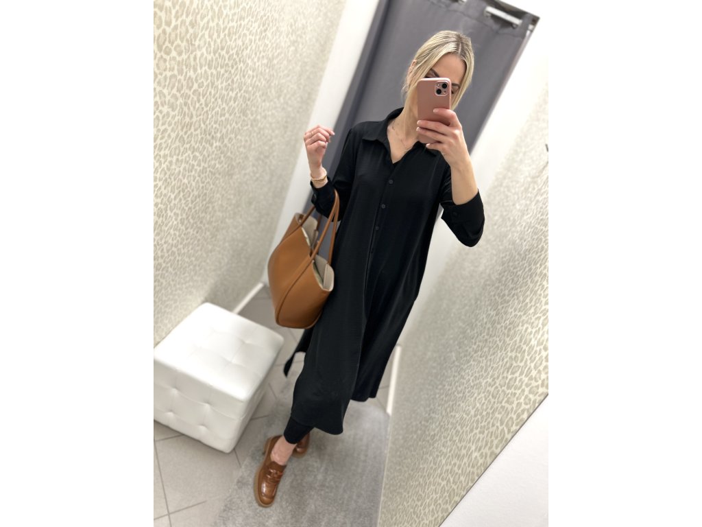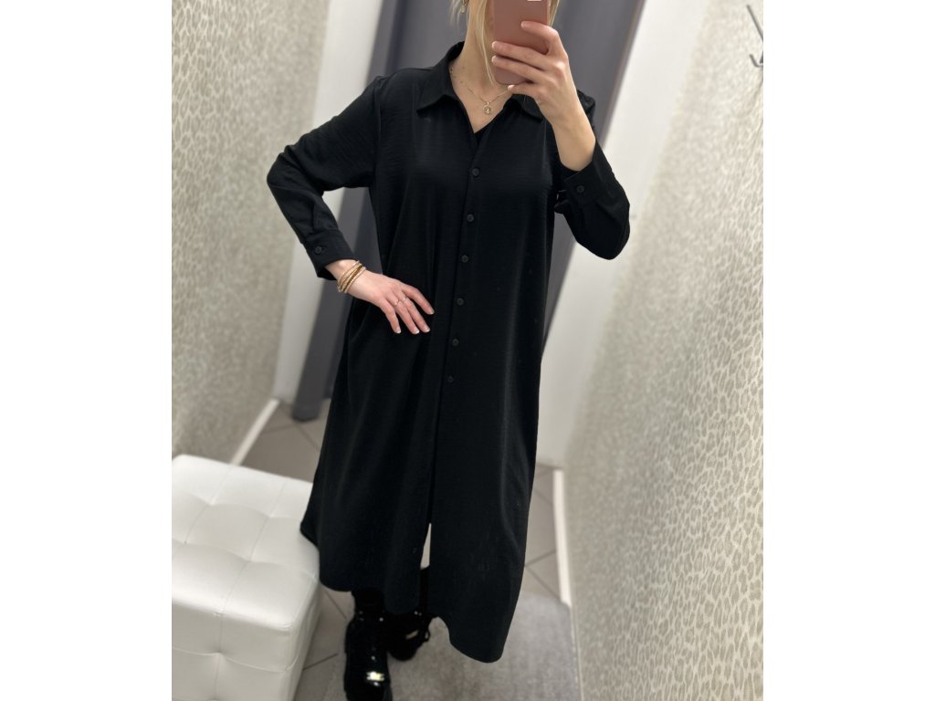 Elegantní černé košilové šaty s knoflíkovým zapínáním a límečkem. Lehký, splývavý materiál a pohodlný střih pro každodenní i elegantní nošení.