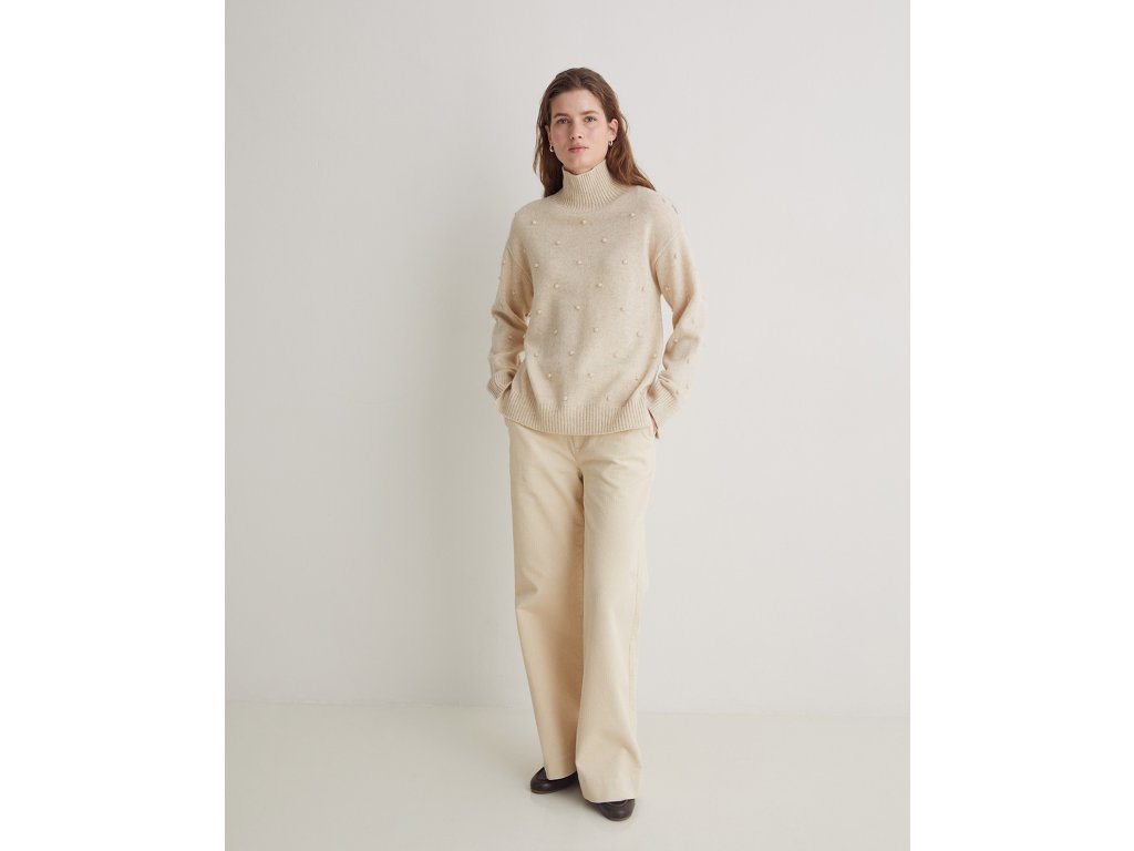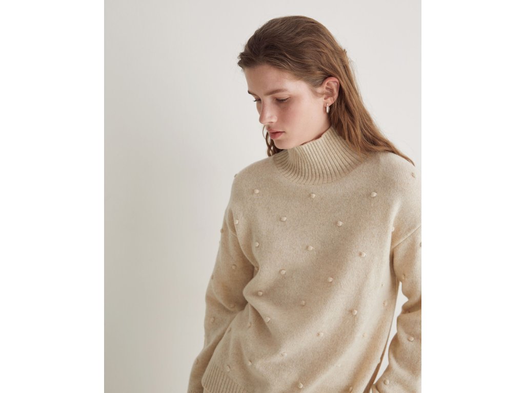 Dominantním prvkem jsou jemné plastické puntíky po celé ploše svetru, které dodávají modelu zajímavý detail bez zbytečné výraznosti. Vyšší žebrovaný stojáček, zakončení rukávů i spodního lemu vytvářejí harmonický celek a podtrhují kvalitní zpracování.