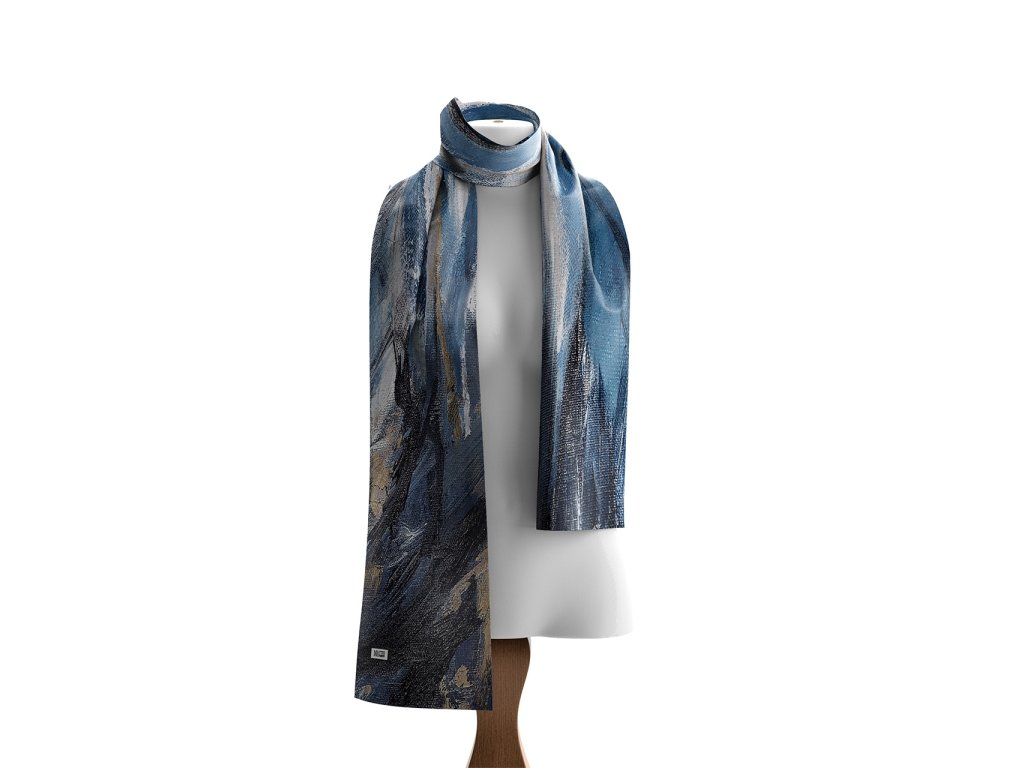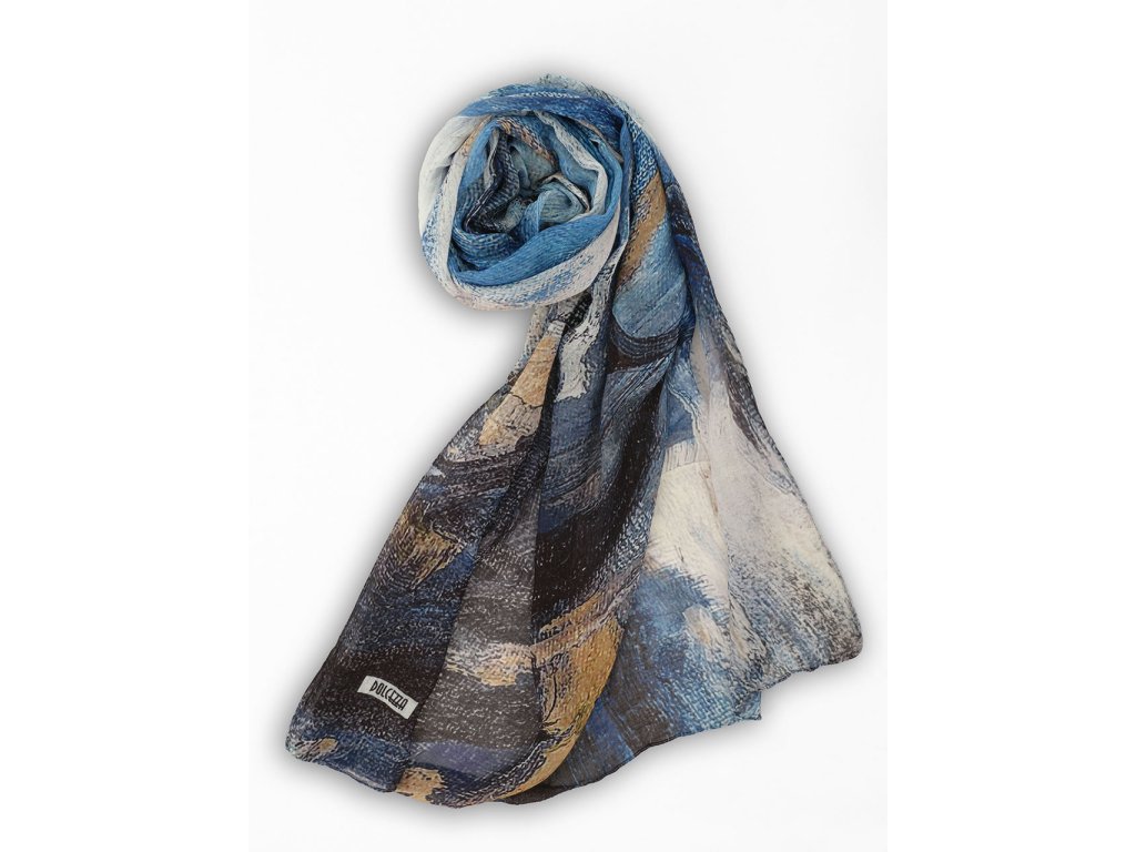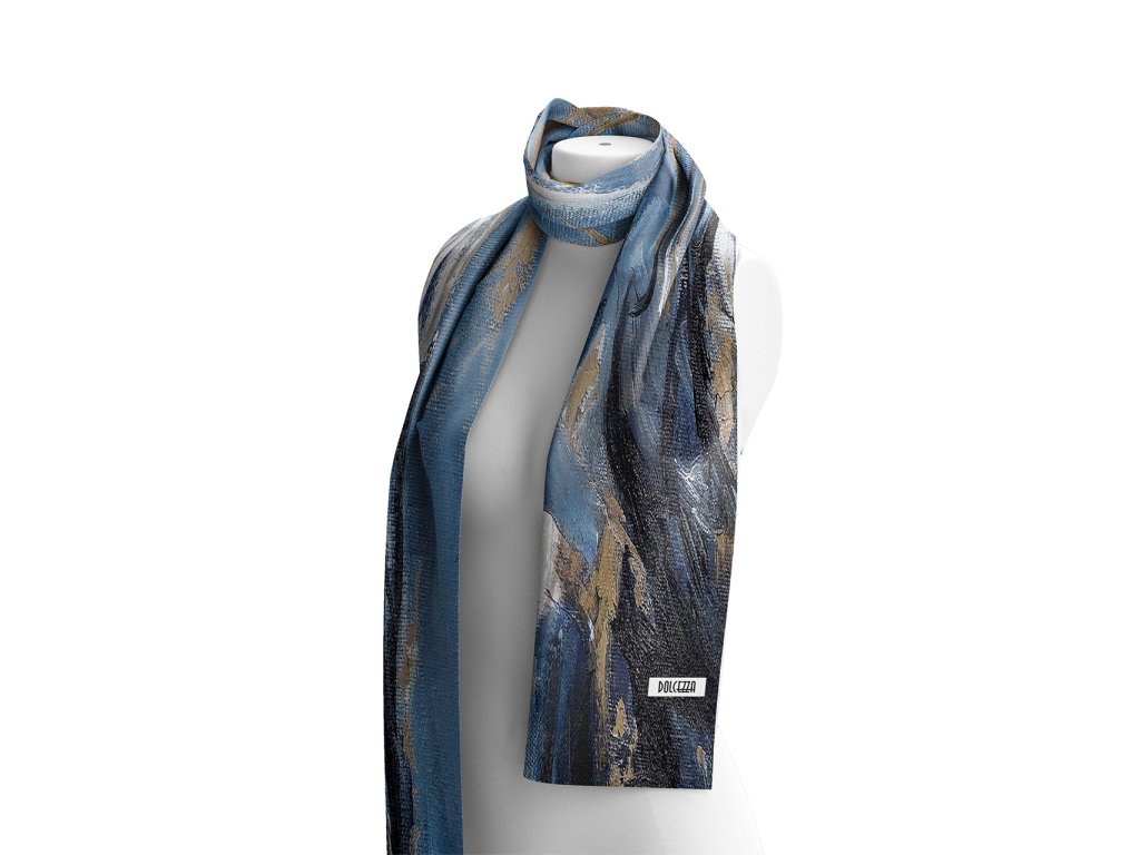 Elegantní šátek Dolcezza ze 100% viskózy s výrazným uměleckým potiskem v tónech modré, černé a zlatavé. Jemný, lehký a příjemný na nošení, ideální jako stylový doplněk k jakémukoli outfitu.