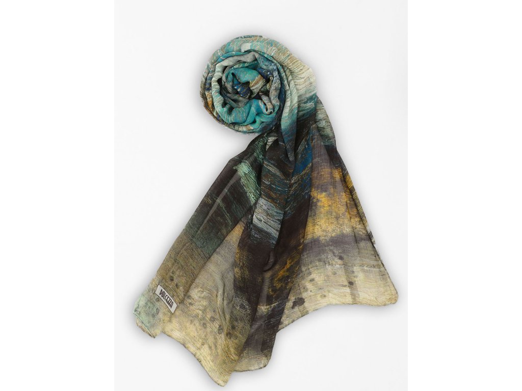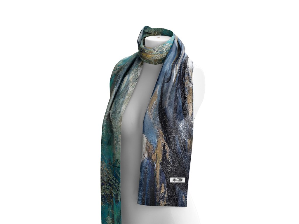 Elegantní šátek Dolcezza ze 100% viskózy s originálním uměleckým potiskem v modro-zemitých tónech. Lehký, jemný a dokonale kombinovatelný doplněk pro každý outfit.