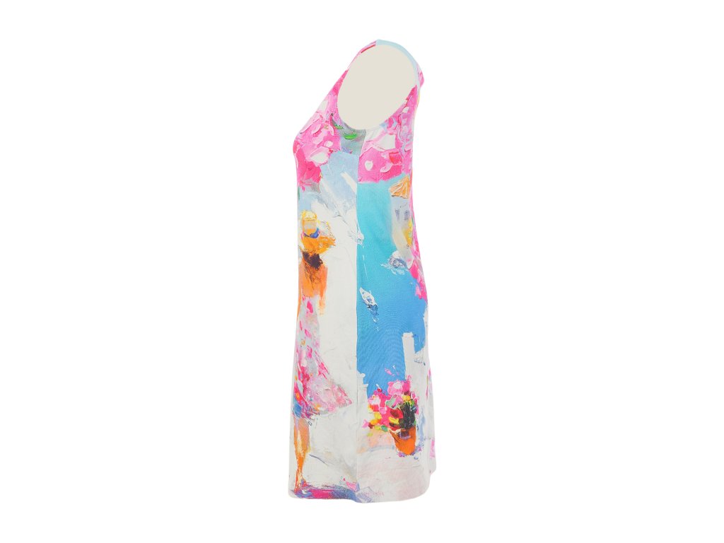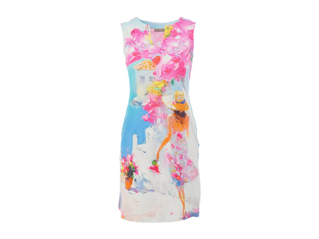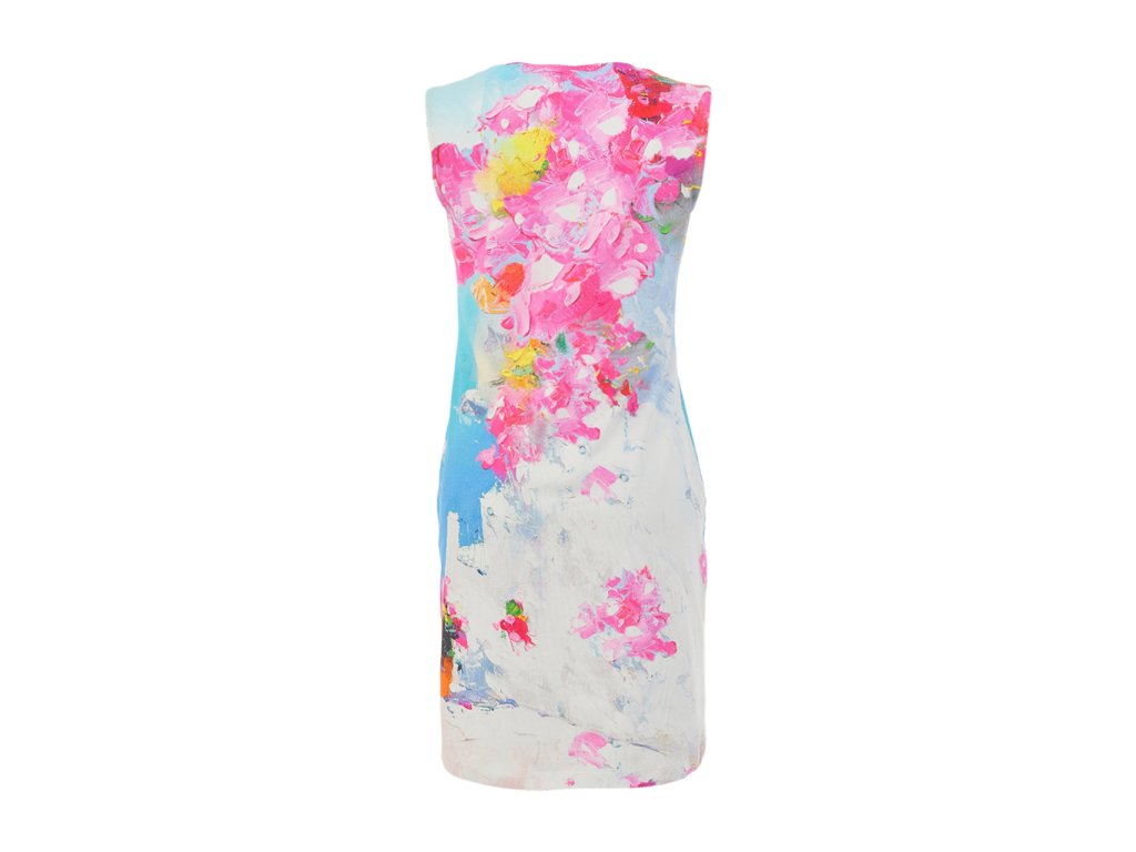 Tyto dámské letní šaty vynikají originálním malovaným motivem v kombinaci svěžích barev, který dodává outfitu výrazný a ženský charakter. Rovný, lehce projmutý střih krásně kopíruje siluetu, aniž by omezoval v pohybu, a je tak ideální jak na dovolenou, tak na běžné letní dny.