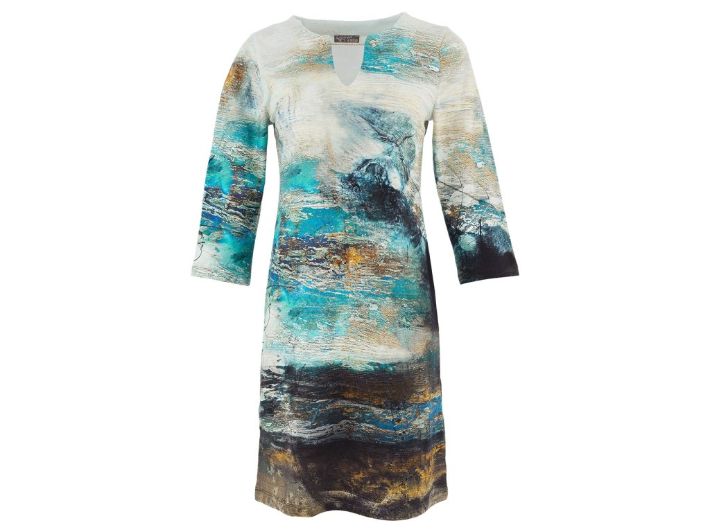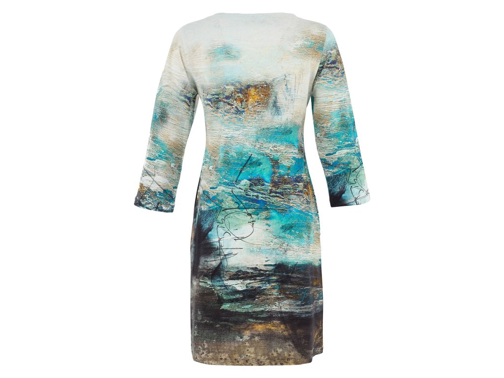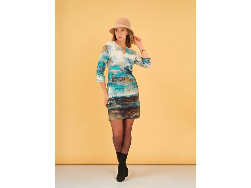 Dámské šaty Dolcezza vynikají svým uměleckým potiskem, který připomíná malířské tahy a dodává celému modelu jedinečný, téměř galerijní vzhled. Střih s 3/4 rukávy a jemným výstřihem do tvaru slzy krásně prodlužuje siluetu a působí velmi žensky.