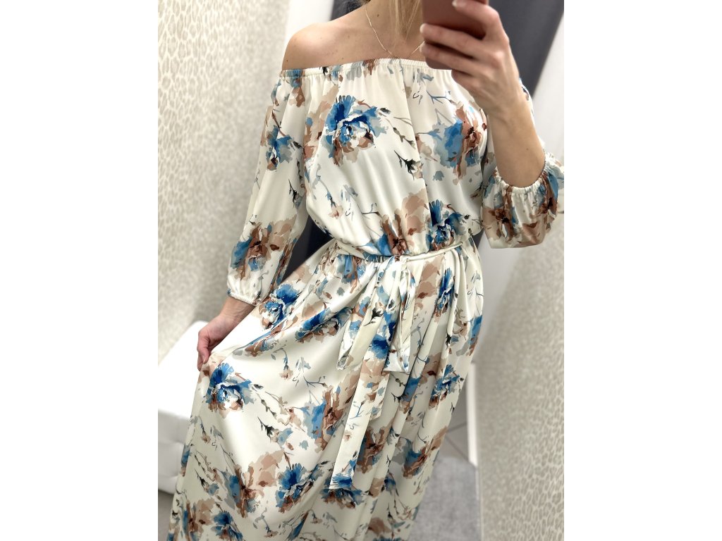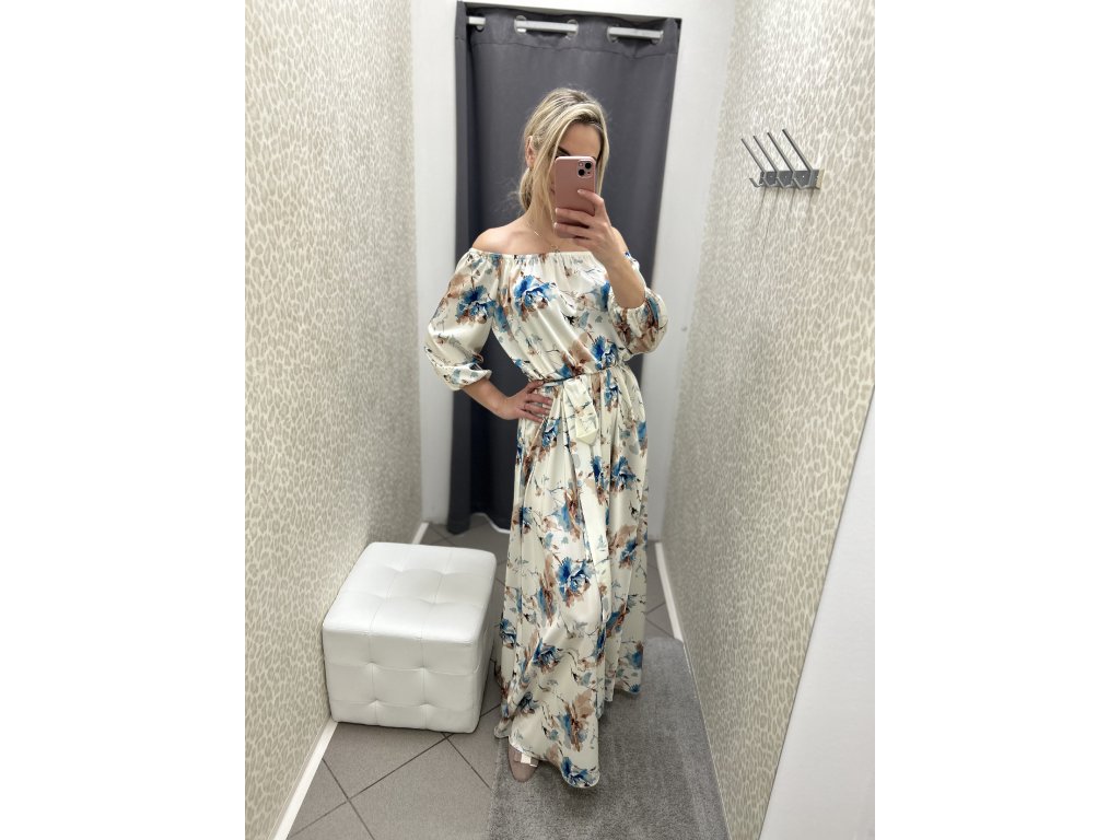 Dlouhé dámské šaty v jemné krémové barvě s výrazným květinovým vzorem v odstínech modré a béžovo-hnědé působí velmi romanticky a zároveň elegantně. Horní část je řešena jako spadlý výstřih (carmen střih) s pružnou gumou, která drží šaty pohodlně na místě a krásně zvýrazňuje ramena. Rukávy jsou zakončeny pružným lemem, což dodává modelu lehkost a vzdušnost.