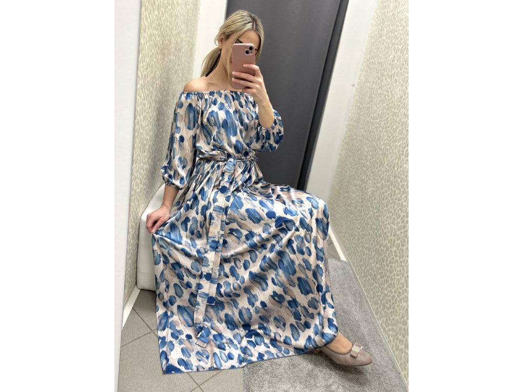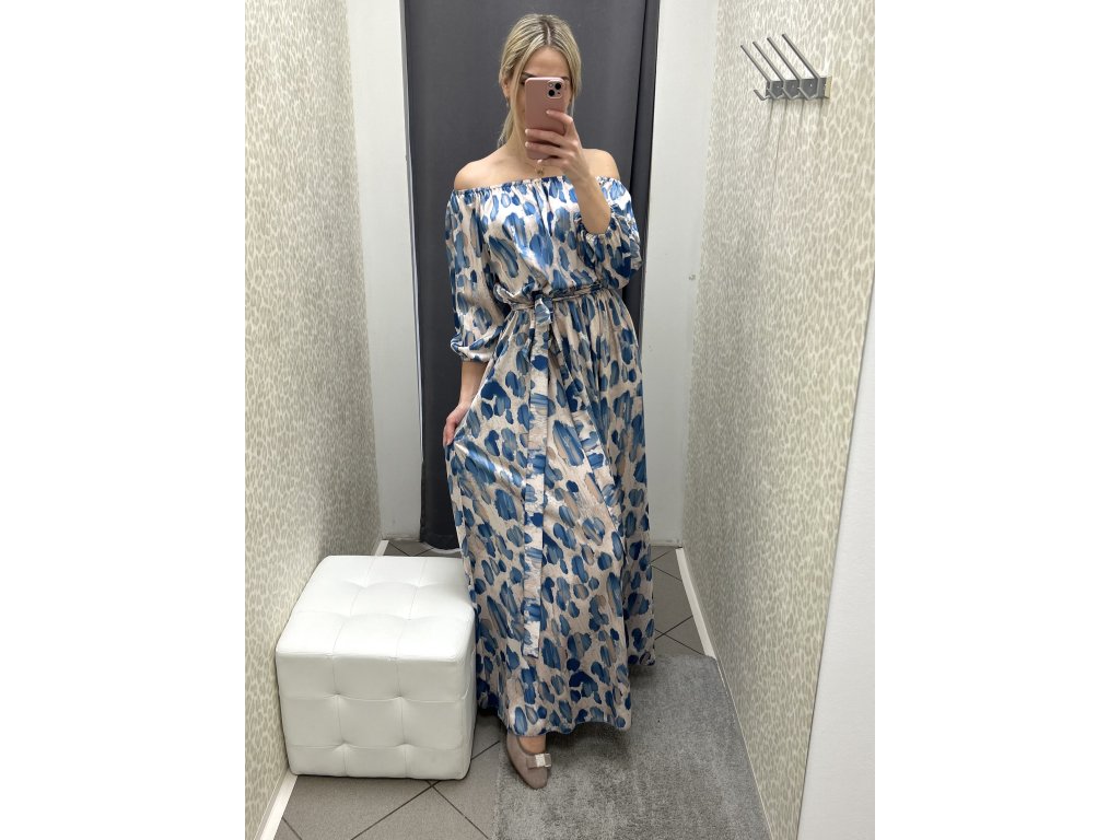 Maxi šaty v harmonické kombinaci modré a béžové barvy působí velmi sofistikovaně a nadčasově. Dominantou modelu je výstřih typu Carmen s odhalenými rameny, který dodává celkovému vzhledu jemný, romantický a zároveň elegantní nádech.