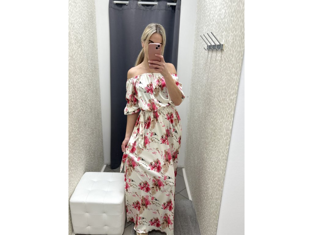 Tyto dlouhé šaty v jemném krémovém základu doplňuje výrazný květinový motiv v odstínech růžové, malinové a béžovo-hnědé, který působí svěže a velmi ženským dojmem. Dominantním prvkem je carmen výstřih s odhalenými rameny, který krásně zvýrazní linii krku a dekoltu a dodá modelu romantický nádech.