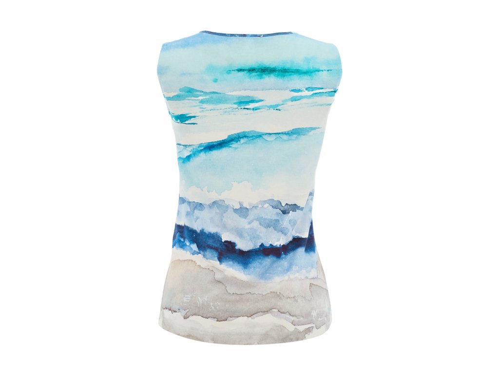 Dámský top značky Dolcezza zaujme na první pohled svým uměleckým akvarelovým vzorem inspirovaným mořskou krajinou. Jemná kombinace modrých, tyrkysových a pískových odstínů dodává modelu lehkost a nadčasovou eleganci. Bezrukávový střih krásně zvýrazní siluetu a je ideální pro teplejší dny. Zajímavým detailem je decentní výstřih s malým kroužkem, který topu dodává ženský a originální vzhled. Díky pružnému a příjemnému materiálu se top pohodlně nosí po celý den a snadno se kombinuje jak s kalhotami, tak se sukní.