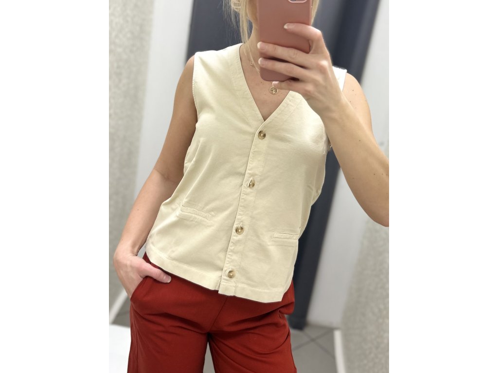 Vesta má rovný střih, elegantní V-výstřih a zapínání na výrazné knoflíky v přírodním tónu, které podtrhují její jemný charakter. Přední část doplňují decentní kapsové lišty, které dodávají modelu moderní vzhled. Díky čistému designu se snadno kombinuje – skvěle vypadá samostatně jako top, ale i vrstvená přes košili, tričko či lehké šaty.