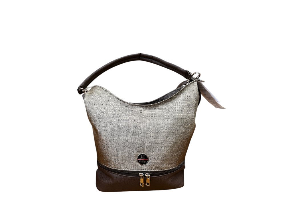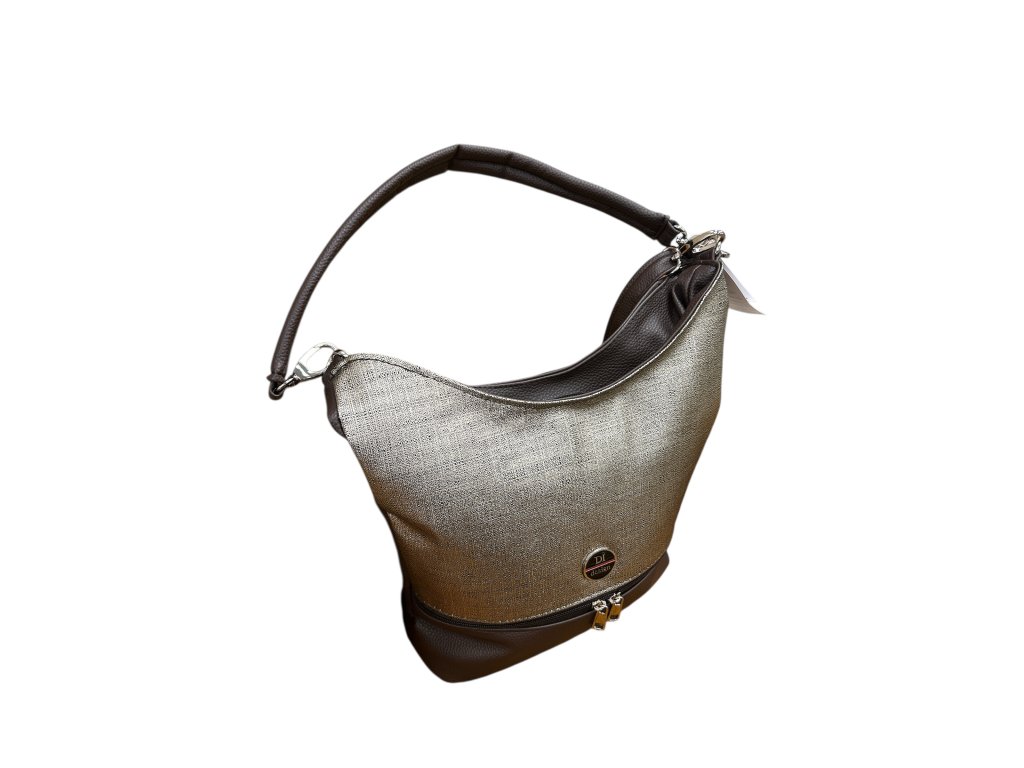 Tato zlatohnědá kabelka Di Design je perfektním doplňkem pro ženy, které hledají eleganci, praktické uspořádání a moderní vzhled v jednom. Horní část kabelky zaujme jemným zlatavým metalickým efektem, zatímco spodní část je vyrobena z pevné syntetické napodobeniny kůže v tmavě hnědém tónu. Společně vytvářejí stylový a nadčasový kontrast.